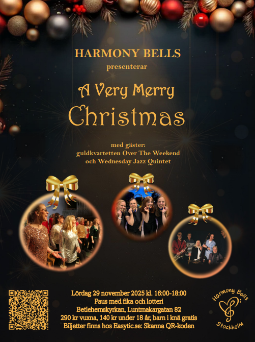 Harmony Bells presenterar - A Very Merry Christmas - 29 November Basic event infoEvent date: Nov 29 2025 - 4:00pm to 6:00pmLocation: Betlehemskyrkan Luntmakargatan 82 Stockholm Sweden See map: Google Maps SE Public event fieldsPublic attachments: Affisch Julkonsert 2025.pdf Program finalized: